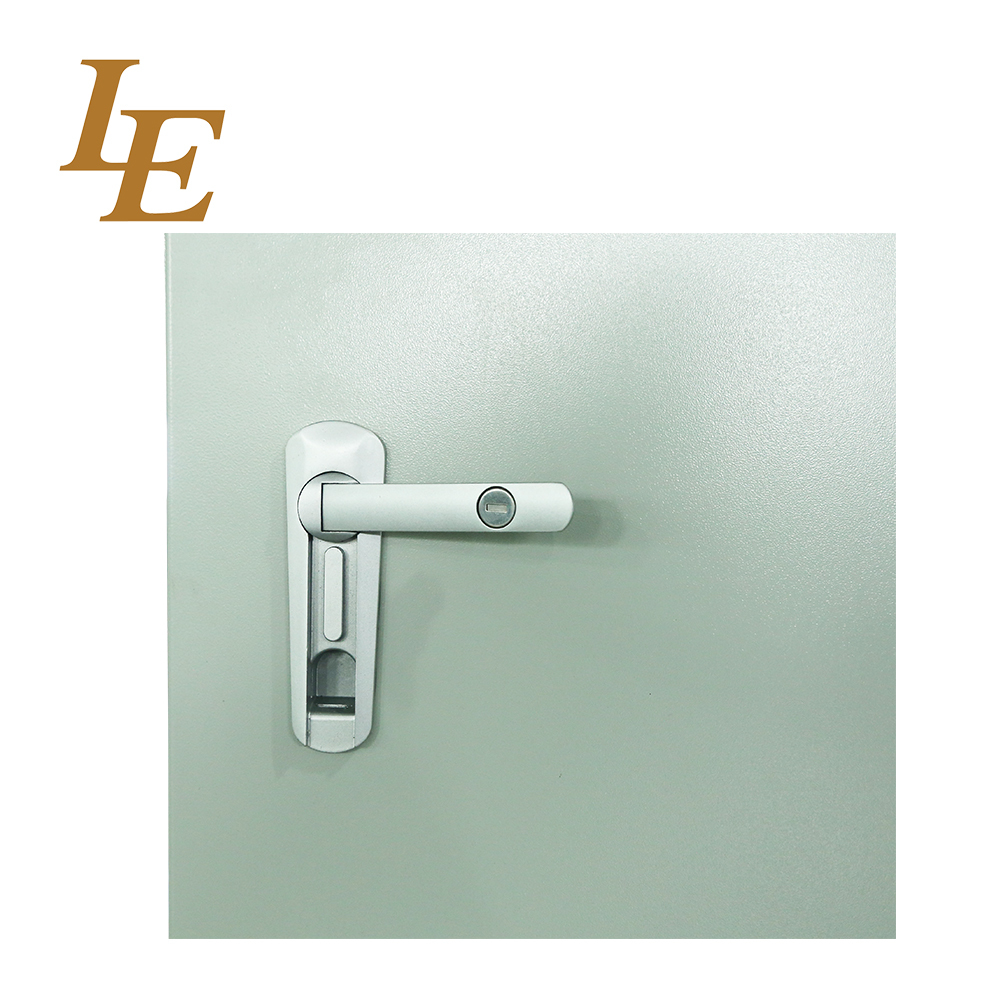 * Hinged door with black composite swing handle, 3-point locking systems & door stay